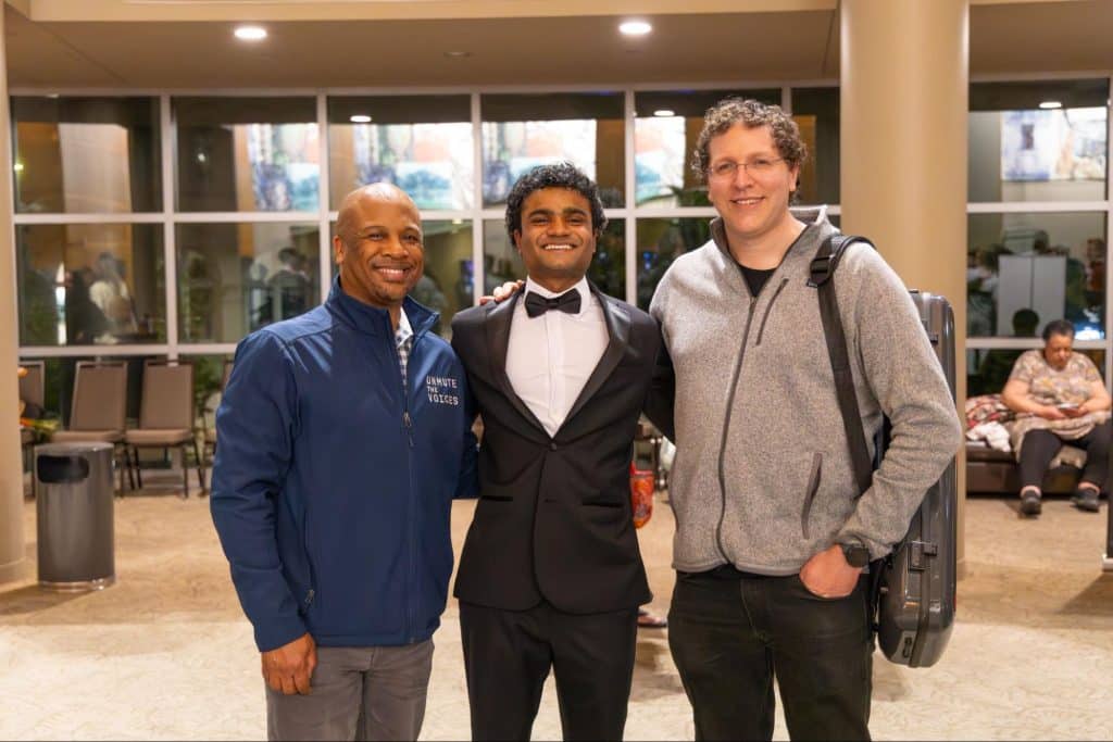 Sid Siravara (center) is congratulated by his music instructors, Dr. Quinton Morris (left) and Noah Geller (right) following his solo debut performance with the Seattle Symphony.